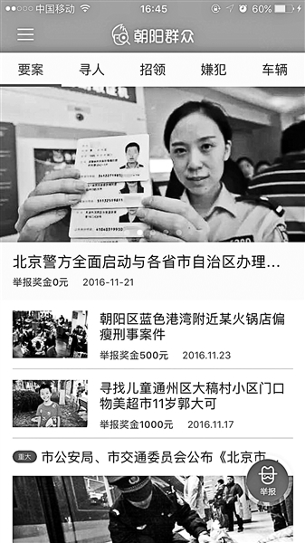 北京青年報(bào)記者下載該APP發(fā)現(xiàn),使用該軟件需要用手機(jī)號(hào)碼注冊(cè)。注冊(cè)后,應(yīng)用頁(yè)面被劃分為“要案”、“尋人”、“招領(lǐng)”、“嫌犯”和“車輛”等多個(gè)板塊。此外,該軟件還內(nèi)置“熱心舉報(bào)”功能,點(diǎn)擊后可出現(xiàn)“兒童拐賣”、“疑似嫌犯”、“老人走失”、“肇事違章”、“遺失招領(lǐng)”和“其他舉報(bào)”的分類,可通過(guò)拍攝小視頻、照片和文字進(jìn)行相關(guān)“舉報(bào)”。