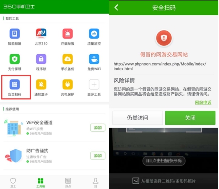 第五,使用360手機衛(wèi)士等安全管理軟件,通過安全掃碼功能掃描二維碼,識別釣魚網站以及手機木馬,保護手機安全不中招。