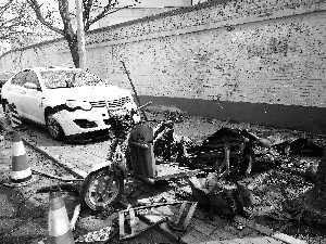 昨日,北京晨報(bào)記者來到酒仙橋二街坊附近,在1號樓樓下聚著一群人,正在討論凌晨爆炸的事情,“簡直就是個(gè)移動隱患”,“還好不是白天,不然肯定有人受傷”。記者看到,一輛綠色三輪車嚴(yán)重?fù)p毀,車輪扭曲倒在地上,車身部分被炸成了一張橫鋪著的大鐵皮,經(jīng)過灼燒后變得焦黑。三輪車的部分零件丟失,旁邊的樹上掛著鐵條,十幾米外的墻邊散落著三輪車的架子,而車輛原本放置電瓶的地方空無一物。在三輪車旁,一個(gè)大煤氣罐被炸成三部分,中間圓筒狀變成一塊鋪展后約1平方米的厚鐵皮,上下兩端則變成兩個(gè)圓形的蓋子(如圖)。