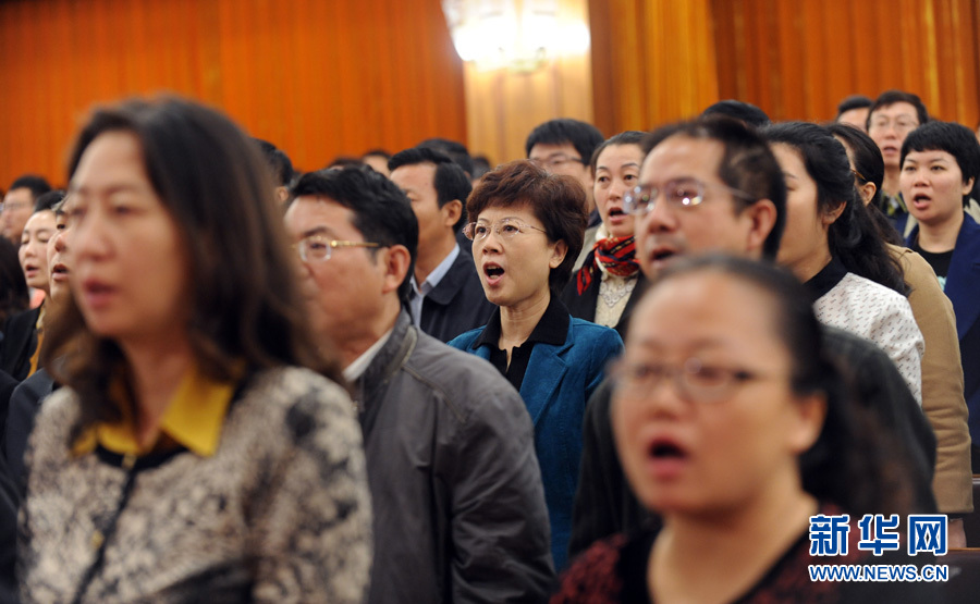2016年10月21日,紀(jì)念紅軍長征勝利80周年大會在人民大會堂舉行。圖為全體起立唱國歌。新華網(wǎng) 陳競超 攝