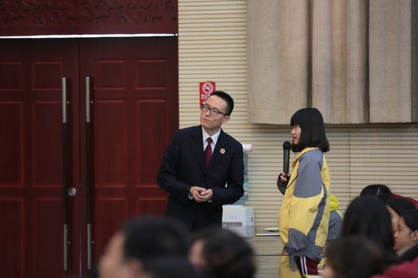 2016年11月21日,“法治進(jìn)校園”全國(guó)巡講團(tuán)講師、天津市紅橋區(qū)未檢干警李小龍?jiān)陉兾魇∥靼彩星恢校c學(xué)生互動(dòng)。