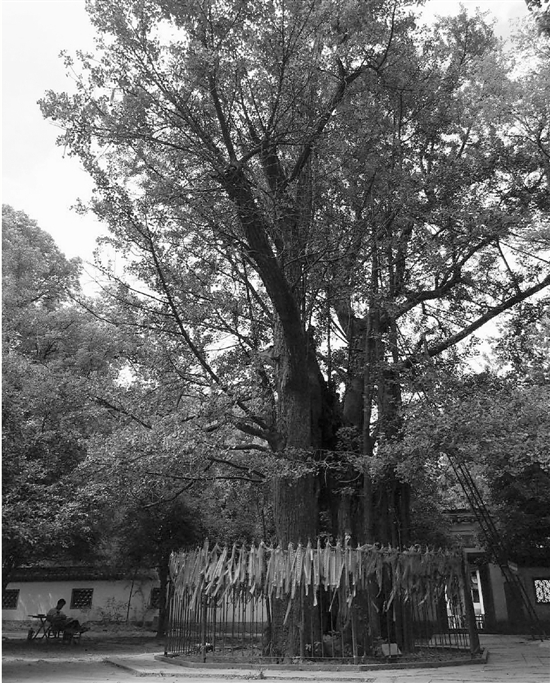 記者專(zhuān)程去西湖邊的五云山,去看山頂那棵杭州最古老的樹(shù),1400多年的銀杏。爬上山,在山頂一眼望過(guò)去,就是那棵古老的銀杏,四周?chē)鷻谏舷禎M(mǎn)了紅色的祈福飄帶。20多米高的樹(shù)干和巨大的樹(shù)冠讓樹(shù)蔭下乘涼的人顯得很小。樹(shù)后面就是真際寺,里面小賣(mài)部的老板說(shuō),天天都有人跑來(lái)看這棵樹(shù),再等幾個(gè)月,秋天銀杏葉黃的時(shí)候,別提多好看了。