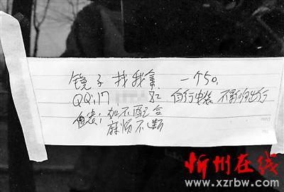 “不但我們家的車輛被撬掉反光鏡,周圍還有四五輛車?!睆埮空f,令人氣憤的是,小偷盜竊反光鏡之后,還專門在車上留下寫有QQ號(hào)的紙條,說可以花50元贖回反光鏡,“紙條上還說,如果不花錢贖回,將來麻煩不斷?!?/p>
