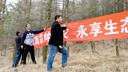 清明節(jié)來臨之際,靜樂公路管理段駐赤泥窊鄉(xiāng)范家洼村扶貧工作隊深入開展護林防火宣傳。圖為工作隊員深入林區(qū)懸掛護林防火標語。(李永珍 攝)