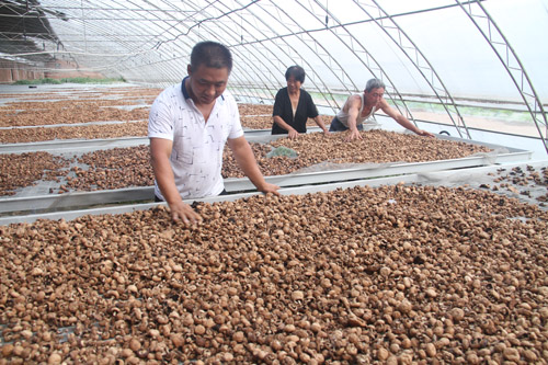 8月1日,原平市雙惠現(xiàn)代農(nóng)業(yè)示范園區(qū)日光溫室大棚內(nèi)工作人員正在整理雙孢菇進行晾曬,制作成干蘑菇,準(zhǔn)備淡季銷售。該園區(qū)充分利用溫室晾曬有效聯(lián)接,延長蘑菇銷售時間,增加菇農(nóng)收入。(褚震 攝)