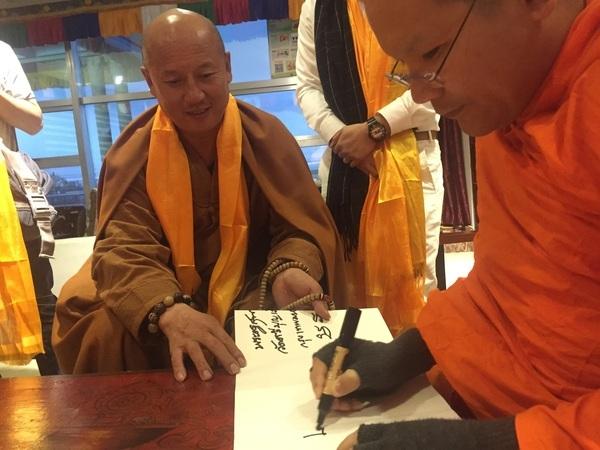 圖為五臺(tái)山望海寺住持釋覺(jué)一法師與弟子們順利到達(dá)西寧機(jī)場(chǎng),木蘭加措法師前往迎接。