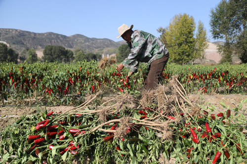 10月8日,靜樂(lè)縣永倉(cāng)種植專業(yè)合作社萬(wàn)畝辣椒種植示范園中10300畝辣椒喜獲豐收。近年來(lái),該縣調(diào)整產(chǎn)業(yè)結(jié)構(gòu),大力發(fā)展無(wú)公害辣椒種植,引進(jìn)種植新品種韓國(guó)紅辣椒。該合作社今年連片訂單栽植的10300 畝辣椒目前長(zhǎng)勢(shì)良好,預(yù)計(jì)平均畝產(chǎn)6000 斤,最高可達(dá)一萬(wàn)斤。今年又是一個(gè)豐產(chǎn)年,大伙的生活就像紅辣椒一樣過(guò)得紅紅火火。圖為合作社工人在收獲辣椒。(閆曉梅 攝)