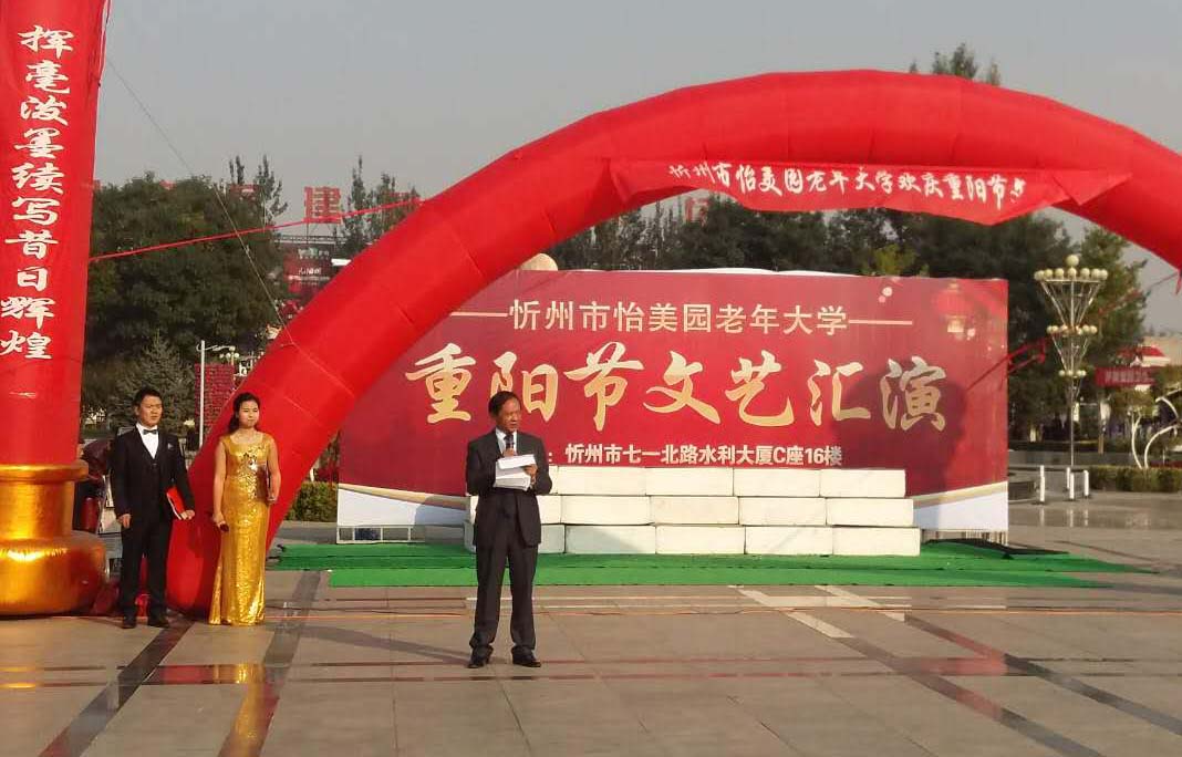 伴隨著怡美園老年大學全體學員共同表演的舞蹈《歡聚一堂》,忻州市怡美園老年大學校長鄧九高代表該校全體師生對老年朋友們致以節(jié)日的慰問,在表達了提倡繼續(xù)發(fā)揚尊老愛老的中華傳統美德,經營好自己的家庭,盡孝心、促和諧,為構建美好和諧的社會氛圍貢獻力量的同時,也對年輕人寄以希望,享受生命,感恩陽光。