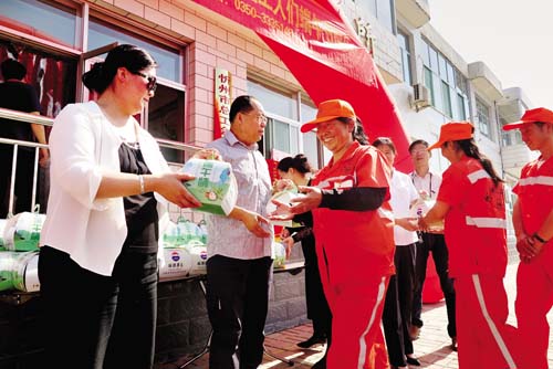 領(lǐng)到粽子的環(huán)衛(wèi)工人們高興不已,市容五所的環(huán)衛(wèi)工人白新云告訴記者:“我覺得很開心,一來過節(jié)有了愛心粽子吃;二來企業(yè)送粽子給環(huán)衛(wèi)工人,是對我們工作的體諒和支持,說明大家看到了我們的付出。現(xiàn)在環(huán)衛(wèi)工作得到越來越多人的關(guān)注,大家齊心協(xié)力為城市的整潔而努力,我們的家園一定會越來越美麗?!毕聢D為工作人員為環(huán)衛(wèi)工人分發(fā)粽子小禮盒(實習(xí)記者 許凈)