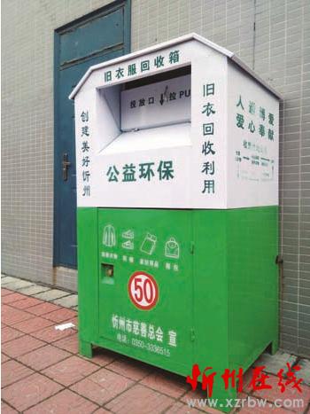 市慈善總會工作人員表示,下一步市慈善總會將與志愿者組織聯(lián)合制作更多的舊衣服回收箱,投放覆蓋忻州城區(qū)所有小區(qū),使我市的慈善捐助工作機(jī)制逐步走向常態(tài)化。圖為設(shè)置在惠民小區(qū)的舊衣物回收箱(魯明強(qiáng))