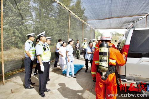 演練假設(shè)當(dāng)日上午10時10分在S206南屯隧道入口處,一輛小型汽車與一輛?;愤\輸車追尾,此次交通事故造成兩人死亡、1人受傷,汽油泄露,隨時有爆炸的危險……110指揮中心接到群眾報警后,立即下達事故救援指令,并通知“120”醫(yī)療急救中心、“119”消防大隊,同時將事故情況向交警大隊進行了匯報,請示該市道路交通安全委員會啟動重特大交通事故應(yīng)急救援預(yù)案。民警趕赴事故現(xiàn)場后,各項救援工作有條不紊進行。現(xiàn)場救援組立即展開受傷人員救護等工作,協(xié)助醫(yī)療隊伍做好傷員救治及傷員轉(zhuǎn)送工作;現(xiàn)場勘查組著手開展了現(xiàn)場勘查、調(diào)查取證等工作;外圍警戒組對現(xiàn)場中心路段進行交通管制,在不同路段堵截分流無關(guān)車輛、人員;善后處理組拖移事故車輛、移送尸體、對事故現(xiàn)場進行了清理。
