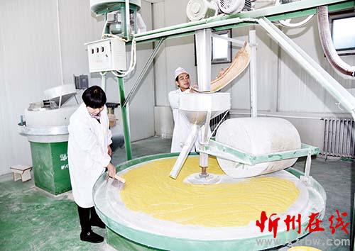 代縣南北兩半坡所產(chǎn)的小米,由于地理環(huán)境特殊,無霜期長,光照充足,晝夜溫差大,不僅色澤金黃品質(zhì)優(yōu),而且口感好,久負(fù)盛名,十分走俏。該公司用石碾加工小米,以散裝每公斤14元、高檔包裝每公斤16元出售,銷往北京、太原等地。圖為公司員工用石碾加工小米(石俊文 劉睿)