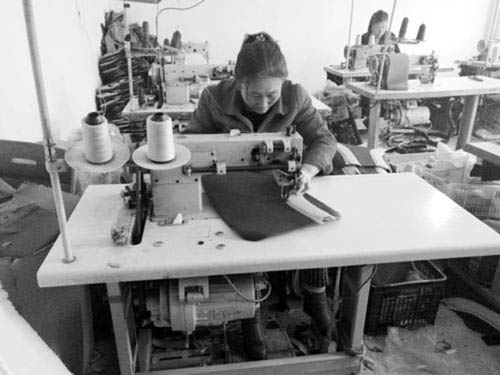 白坡頭村追夢箱包加工廠的女工正在縫紉機(jī)上操作