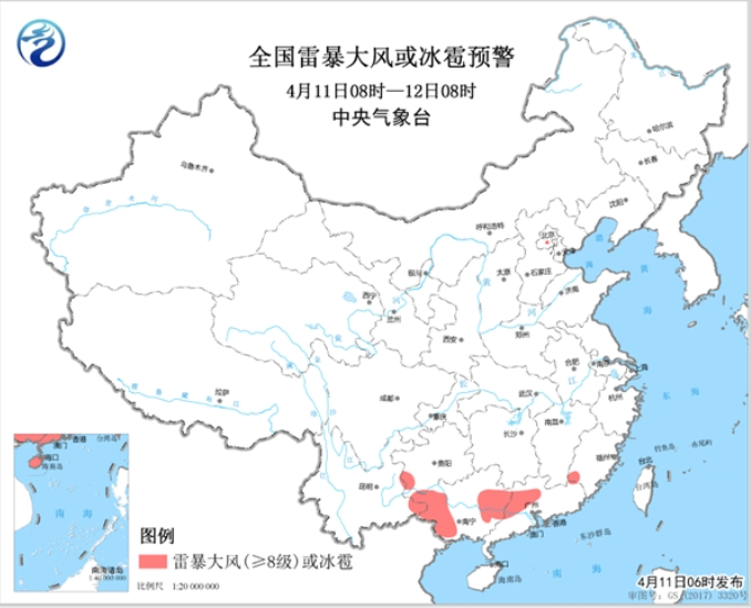 預(yù)計(jì)4月11日08時(shí)至12日08時(shí),貴州西南部、福建西南部、廣西西部和東部、廣東西北部等地的局地將有8-10級(jí)雷暴大風(fēng)或冰雹天氣;此外,貴州西南部、福建西部、廣西大部、廣東中北部等地的部分地區(qū)將有短時(shí)強(qiáng)降水天氣,小時(shí)雨強(qiáng)20-40毫米,局地可達(dá)50毫米以上。