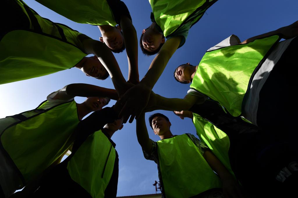 ↑這是初三116班的足球隊隊員在比賽開始前為自己加油鼓勁(4月17日攝)。新華社記者詹彥攝