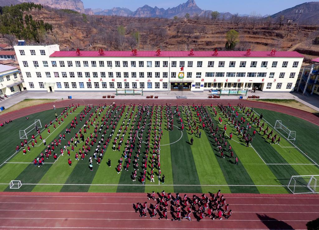 ↑這是學(xué)生們在做足球操(4月16日無人機拍攝)。新華社記者詹彥攝