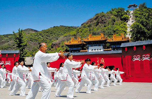 5月5日,北京平谷區(qū)劉家店鎮(zhèn)舉辦丫髻山第三十屆休閑文化廟會(huì),開(kāi)展威風(fēng)鑼鼓、秧歌花會(huì)、百人太極等表演活動(dòng)和書(shū)法雅集、文創(chuàng)展示等文化活動(dòng),吸引大批來(lái)自京津冀地區(qū)的游人參加。圖為劉家店鎮(zhèn)的老年人在文化廟會(huì)上表演太極拳。新華社記者 李欣 攝