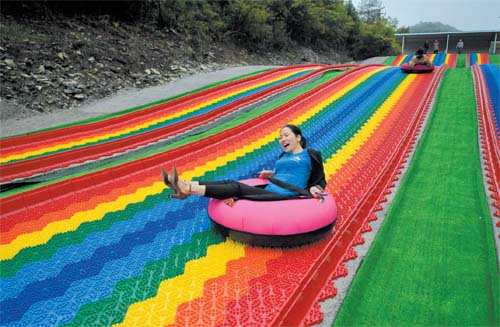 湖北省恩施土家族苗族自治州宣恩縣沙道溝鎮(zhèn)二臺坪村是個三面臨崖的高山鄉(xiāng)村,在實施精準(zhǔn)扶貧過程中,于2018年修通了進村水泥路。隨著交通條件的改善,當(dāng)?shù)卮迕衤?lián)合成立旅游經(jīng)營公司,推進以綠色生態(tài)為底色的“多彩鄉(xiāng)村游”,讓昔日沉寂的鄉(xiāng)村變得多姿多彩。圖為5月13日,游客在湖北省宣恩縣二臺坪村的游樂場體驗滑草樂趣。