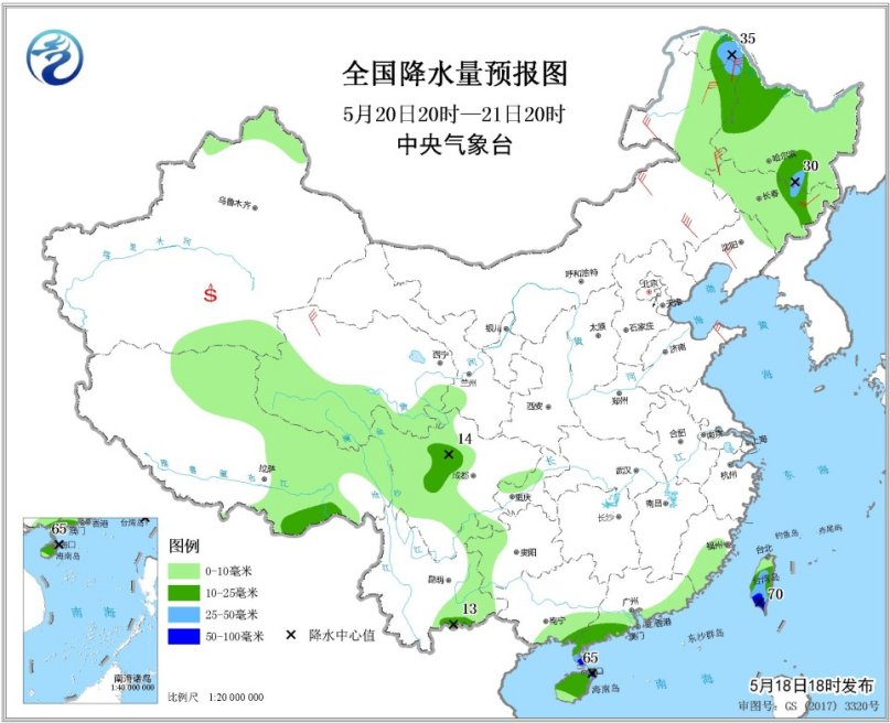5月19日20時至20日20時,內(nèi)蒙古東北部、東北地區(qū)中北部、江南南部和東部、華南大部等地的部分地區(qū)有中到大雨,局地有暴雨(50~70毫米)。內(nèi)蒙古中東部、華北、黃淮、東北地區(qū)中南部等地的部分地區(qū)有4~6級風,陣風7~8級。南疆盆地等地局地有揚沙或浮塵。渤海西南部海域?qū)⒂?~8級、陣風9~10級的西北風。