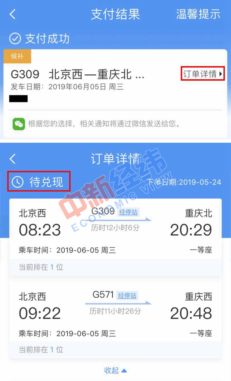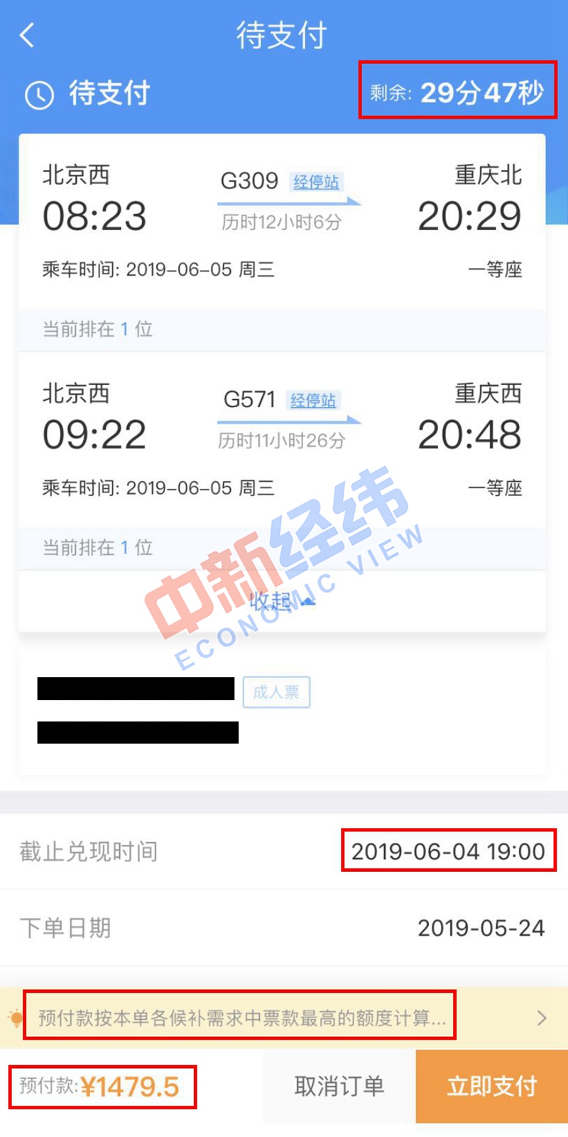 5、支付候補(bǔ)訂單。值得注意的是,候補(bǔ)訂單的支付需要在30分鐘內(nèi)完成,預(yù)付款按本單各候補(bǔ)需求中票款最高的額度計(jì)算。如果候補(bǔ)成功(即在兌現(xiàn)時(shí)間前搶到車票),預(yù)付票款中多出的部分,將自動(dòng)退回差額給原賬戶;如果候補(bǔ)購(gòu)票失敗(即在兌現(xiàn)時(shí)間前未搶到車票),預(yù)付款將全額退回。