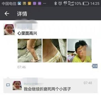 朋友圈圖片顯示:男孩受傷嚴重,眼睛被打腫,大小腿有多處傷痕。圖片轉自另一男子,最讓人覺得不可理喻的是,該男子不僅在朋友圈曬出孩子被打傷的圖片,還配文稱“心里面高興”、“我會繼續(xù)折磨死兩個小孩子”。另外還搭配自拍照稱“我曾經說過我要死我會讓你們先死”并跟帖“從今天開始見一個殺一個”。