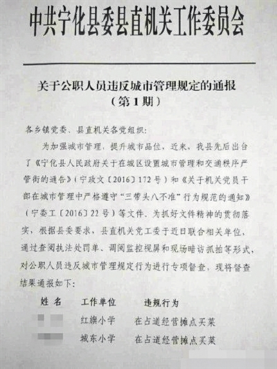 寧化縣發(fā)布的有關(guān)教師買(mǎi)菜違規(guī)的通報(bào)。 因?yàn)橐环萃▓?bào)文件,福建寧化縣的兩名小學(xué)教師“火了”。 近日,一份由寧化縣直機(jī)關(guān)工作委員會(huì)簽發(fā)的通報(bào),在網(wǎng)絡(luò)引發(fā)熱議。通報(bào)中稱(chēng),該縣兩名小學(xué)老師,因?yàn)椤霸谡嫉澜?jīng)營(yíng)攤點(diǎn)買(mǎi)菜”,被面向全縣通報(bào)。而寧化縣委黨工委一名工作人員據(jù)此向新京報(bào)記者回應(yīng)稱(chēng),簽發(fā)此通報(bào)的目的,在于“引以為戒”,兩名涉事教師除批評(píng)教育外,不會(huì)有更進(jìn)一步的處理決定。 買(mǎi)菜被全縣通報(bào) 爭(zhēng)議由一份通報(bào)文件開(kāi)始。網(wǎng)傳圖片顯示,一份抬頭為“中共寧化縣委縣直機(jī)關(guān)工作委員會(huì)”的《關(guān)于公職人員違反城市管理規(guī)定的通報(bào)》中,寧化縣針對(duì)公職人員違反城市管理規(guī)定行為進(jìn)行專(zhuān)項(xiàng)督查,并對(duì)部分公職人員進(jìn)行了公開(kāi)通報(bào)。其中,文件第一頁(yè)列明,兩名工作單位分別為紅旗小學(xué)和城東小學(xué)的教師,因?yàn)椤霸谡嫉澜?jīng)營(yíng)攤點(diǎn)買(mǎi)菜”的違規(guī)行為,受到通報(bào)處理。 新京報(bào)記者注意到,上述通報(bào)文件照片,最早由三名當(dāng)?shù)鼐W(wǎng)友通過(guò)論壇發(fā)布。該名網(wǎng)友稱(chēng),通報(bào)名單由寧化縣縣直機(jī)關(guān)黨工委,經(jīng)過(guò)查閱執(zhí)法處罰單、調(diào)閱監(jiān)視視頻和現(xiàn)場(chǎng)暗訪抓拍等手段確定,并下發(fā)至全縣各縣直機(jī)關(guān)黨組織,以及各鄉(xiāng)鎮(zhèn)黨委。 在接受新京報(bào)記者采訪時(shí),寧化縣委黨工委一名工作人員確認(rèn)了上述文件的真實(shí)性。這名工作人員介紹,文件于10月21日發(fā)布,屬于針對(duì)公職人員違規(guī)行為系列通報(bào)的第一期,共有11人“上榜”,其中,有4人為教師,除“在占道經(jīng)營(yíng)攤點(diǎn)買(mǎi)菜”外,還涉及未按規(guī)定佩戴頭盔等情形。 寧化縣紅旗小學(xué)一名工作人員介紹,目前涉事教師仍然正常在崗,而關(guān)于這名教師的具體信息,其稱(chēng)不便透露。 當(dāng)?shù)胤Q(chēng)僅作為批評(píng)警示 在路邊攤點(diǎn)買(mǎi)菜,卻被全縣范圍通報(bào)。有網(wǎng)友質(zhì)疑,寧化縣這一做法“用力過(guò)猛”。在接受新京報(bào)記者采訪時(shí),寧化縣委黨工委上述工作人員稱(chēng),這一通報(bào)依據(jù),系由寧化縣委出臺(tái)的《關(guān)于機(jī)關(guān)黨員干部在城市管理中嚴(yán)格遵守“三帶頭八不準(zhǔn)”行為規(guī)范的通知》。通知中,對(duì)于黨員干部的違規(guī)情形和處理結(jié)果進(jìn)行了規(guī)定。 新京報(bào)記者注意到,這份名為《關(guān)于機(jī)關(guān)黨員干部在城市管理中嚴(yán)格遵守“三帶頭八不準(zhǔn)”行為規(guī)范的通知》的文件要求,全縣機(jī)關(guān)黨員干部要堅(jiān)決執(zhí)行八不準(zhǔn),其中第一條即為“不準(zhǔn)在占道和流動(dòng)攤點(diǎn)買(mǎi)菜、就餐等購(gòu)物行為”。 通知中稱(chēng),對(duì)違反《行為規(guī)范》規(guī)定的行為,將采取暗訪抓拍、街道巡查等方式進(jìn)行專(zhuān)項(xiàng)督查,并“定期深入有關(guān)單位查閱執(zhí)法處罰單或調(diào)閱寧化縣機(jī)關(guān)黨員干部嚴(yán)格遵守城市管理”三帶頭八不準(zhǔn)“行為規(guī)范監(jiān)控視頻,了解掌握黨員干部違規(guī)情況”。此外,針對(duì)違反這一規(guī)定的機(jī)關(guān)黨員干部,“一經(jīng)查實(shí),一律通報(bào),并視違規(guī)次數(shù)給予提醒談話、書(shū)面檢討、誡勉教育等處理,同時(shí)依違規(guī)次數(shù)扣發(fā)個(gè)人及單位精神文明獎(jiǎng)金?!?/p> 寧化縣委黨工委回應(yīng)稱(chēng),對(duì)于上述兩名涉事教師,當(dāng)?shù)貎H作為批評(píng)警示,目的是“發(fā)揮黨員干部在城市管理中的示范表率作用”,不會(huì)再有進(jìn)一步的處理措施。(記者王煜) (責(zé)任編輯:梁艷) |