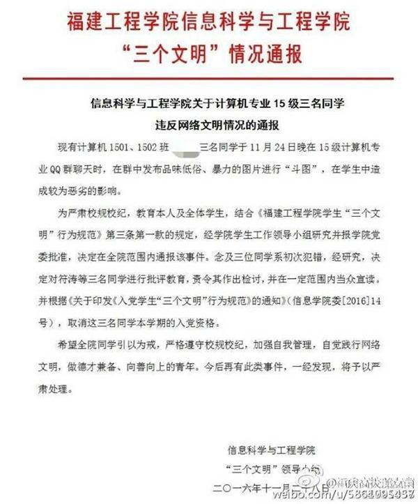 近日,一則“福建工程學(xué)院某專業(yè)三名學(xué)生因在QQ群上‘斗圖’,被學(xué)校通報批評”的微博在網(wǎng)絡(luò)上傳播。 《通報》稱,三名學(xué)生在群里發(fā)布了品位低俗、暴力的進行“斗圖”,違反了“網(wǎng)絡(luò)文明”,決定對三名同學(xué)進行批評教育,并取消相關(guān)同學(xué)本學(xué)期的入黨資格。 對此,福建工程學(xué)院信息科學(xué)與工程學(xué)院一名知情教師表示,該份《通報》確實出自學(xué)院,“外界沒有看到群里的內(nèi)容,想象不到有多嚴重?!彼嬖V澎湃新聞,除了在QQ群里發(fā)布大量低俗、暴力圖片外,在學(xué)院黨委書記的提醒下,三位同學(xué)不僅沒有收斂,反而在群里調(diào)侃黨委書記。