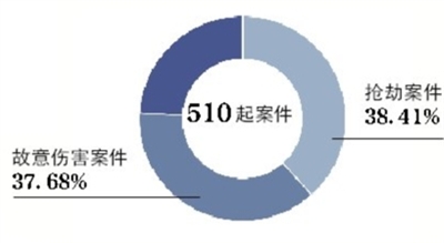廣東省檢察機關(guān)2013年至2015年受理移送審查起訴校園暴力案件,510起案件中,搶劫、故意傷害案件分別占38.41%及37.68%