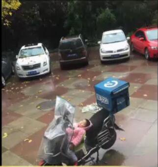 小女孩雨中躺在電動(dòng)車上睡覺(jué)
