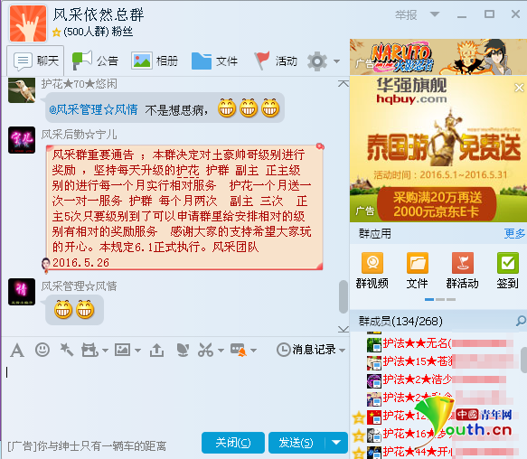 在“風采依然總群”內,中國青年網(wǎng)記者看到,成員共有268人。男性群成員被稱為“土豪帥哥”,按照貢獻大小分為情郎、護法、護花、護群、名譽副主、名譽正主、風采親王7個等級。群主制定了一套升級規(guī)則,方式是在群內發(fā)紅包,男性群成員只能搶自己發(fā)的紅包,搶錯了必須發(fā)出來,否則會被移出群。女性群成員提供色情聊天服務,可以搶所有的紅包。