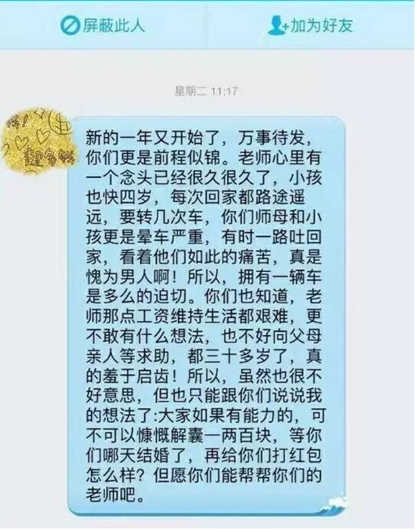 網(wǎng)帖中還上傳了數(shù)張疑似該老師與學生的QQ聊天截圖,其中的一張截圖中的對話道出了老師“眾籌”買車的原因:“新的一年又開始了,萬事待發(fā),你們更是前程似錦。老師心里有個念頭已經(jīng)很久了,小孩也快四歲了,每次回家都路途遙遠,要轉(zhuǎn)幾次車,你們師母和小孩更是暈車嚴重,有時一路吐回家,看看他們?nèi)绱送纯?,真是愧為男人??!所以,擁有一輛車是多么的迫切。你們也知道老師那些工資維持生活都很艱難,更不敢有什么想法,也不好向父母親人求助,都三十多歲了,真的羞于啟齒!所以,雖然也很不好意思,但是也只能跟你們說說我的想法了:大家如果有能力的,可不可以慷慨解囊一兩百塊,等你們哪天結(jié)婚了,再給你們打紅包怎么樣?但愿你們能幫幫你們的老師吧?!?/p>
