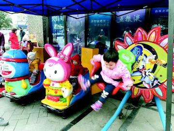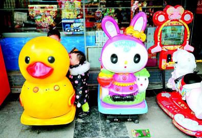 放在商店前的搖搖車等街頭小型游樂設(shè)施,因乘坐價(jià)格便宜、造型卡通、色彩鮮艷,帶給低齡小朋友樂趣,受到不少小朋友的歡迎,圖為兩個(gè)小朋友搶坐一臺(tái)搖搖車。 本報(bào)記者