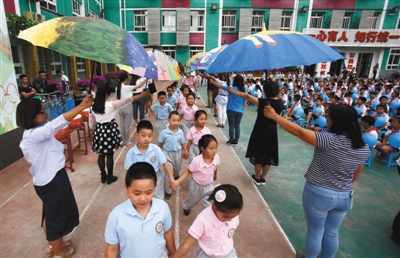 2016年9月1日,海淀區(qū)雙榆樹一小,家長撐起手繪的傘歡迎一年級新生。按照北京市當(dāng)時規(guī)定,凡年滿6周歲(2010年8月31日以前出生)的兒童參加信息采集,不滿6周歲(2010年8月31日以后出生)的兒童不能采集。資料圖片/新京報記者 浦峰 攝