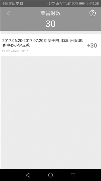 “你下載‘志愿匯’APP,第二天直接登錄無需注冊(cè),登錄名是身份證號(hào)碼,密碼為后八位?!卑凑仗崾荆浾咪浫肓讼嚓P(guān)信息,選擇了30個(gè)小時(shí)的志愿時(shí)長(zhǎng)。第二天,打開“志愿匯”后,上面果然顯示了30個(gè)小時(shí)的志愿時(shí)長(zhǎng),還有詳細(xì)的志愿地點(diǎn)、時(shí)間,和記者填寫的信息一致。