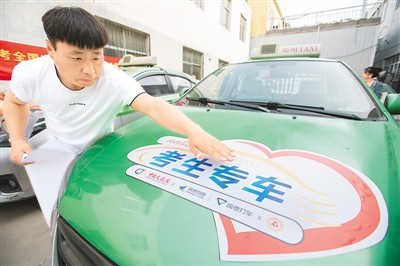 網(wǎng)絡(luò)出行平臺(tái)高德打車(chē)聯(lián)合有關(guān)方面推出“愛(ài)心送考 ”免費(fèi)服務(wù)。圖為參與提供服務(wù)的工作人員給車(chē)貼相關(guān)標(biāo)識(shí)。