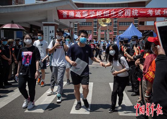 7月7日上午,北京市豐臺區(qū),北京市第十二中學考點,結束上午的考試后,高考考生們走出考場,一位考生從人群中牽起家人的手。當天是2020年全國統(tǒng)一高考第一天,據(jù)了解,今年北京市高考在7月7日至10日舉行,共49000多名考生,設17個考區(qū),132個考點學校,2867個考場,每考場考生人數(shù)由過去的30人減至20人。中青報·中青網(wǎng)記者 李崢苨/攝