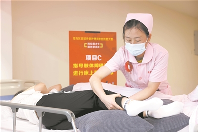 在安徽省合肥市瑤海區(qū)首屆養(yǎng)老護(hù)理員職業(yè)技能大賽現(xiàn)場,選手參加護(hù)理技能比賽。新華社發(fā)(解琛攝)