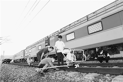重慶電子工程職業(yè)學(xué)院師生正在使用軌枕螺栓高精度智能檢測(cè)與檢修設(shè)備進(jìn)行現(xiàn)場(chǎng)勘測(cè)。受訪者供圖