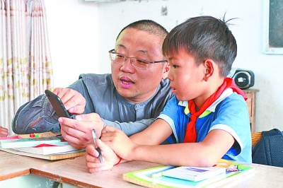 張海波(左)正在教學(xué)生合理使用手機(jī)。資料圖片