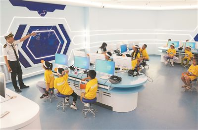 7月8日,在極地海洋研學(xué)教育基地“淘學(xué)企鵝館”的VR教室,工作人員在給孩子們進(jìn)行科普授課。新華社記者 王建威攝