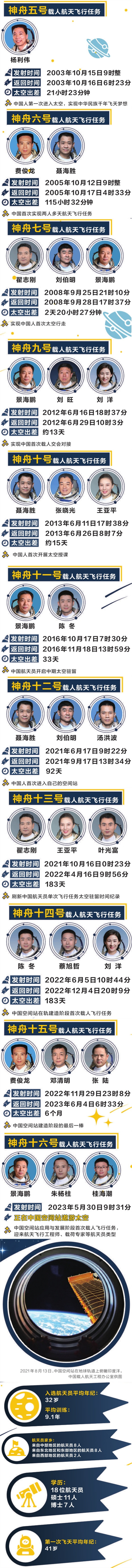 中國的航天員隊伍同樣經(jīng)歷了這樣的選拔和訓(xùn)練過程。2003年,中國航天史上第一位叩響宇宙之門的航天員楊利偉進入太空,揭開了中國載人航天的新篇章。那之后,費俊龍、聶海勝、翟志剛、劉伯明、景海鵬、劉洋、劉旺、王亞平、張曉光、陳冬、湯洪波、葉光富、蔡旭哲、鄧清明、張陸、朱楊柱、桂海潮……截至目前,一共18位中國航天員成功逐夢九天,太空一次又一次迎來中國人的身影。