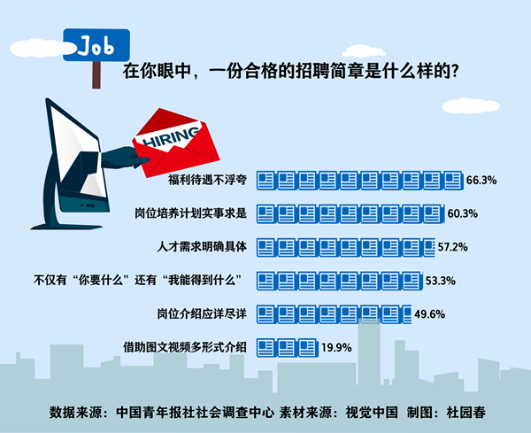 日前,中國青年報社社會調(diào)查中心聯(lián)合問卷網(wǎng)(wenjuan.com),對1334名應(yīng)屆大學(xué)生進(jìn)行的一項(xiàng)調(diào)查顯示,在他們眼中,一份合格的招聘簡章,首先是福利待遇不浮夸(66.3%),其次是崗位培養(yǎng)計劃實(shí)事求是(60.3%),再次是人才需求明確具體(57.2%)。