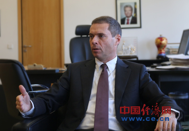 采訪結(jié)束后,中國(guó)經(jīng)濟(jì)網(wǎng)記者向柯慕賢介紹中國(guó)國(guó)家重點(diǎn)新聞媒體的基本情況??釔坶L(zhǎng)跑的柯慕賢工作起來就像德國(guó)的汽車,馬力十足。性格穩(wěn)重的他半開玩笑地告訴記者,對(duì)德國(guó)人來說,壓力是塊寶,壓力帶來動(dòng)力。中國(guó)經(jīng)濟(jì)網(wǎng)記者 劉若星 攝