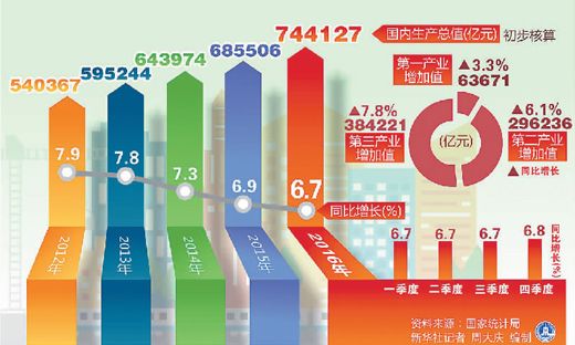 本報北京1月20日電 (記者陸婭楠)國家統(tǒng)計局1月20日公布,初步核算,2016年我國國內(nèi)生產(chǎn)總值首次邁上“70萬億”臺階,為744127億元,按可比價格計算,比上年增長6.7%。