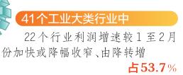 統(tǒng)計數(shù)據(jù)顯示,在41個工業(yè)大類行業(yè)中,有22個行業(yè)利潤增速較1至2月份加快或降幅收窄、由降轉(zhuǎn)增,占53.7%。