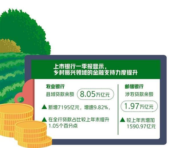 近日,各家上市銀行一季報先后披露完畢。從公開數據看,中國農業(yè)銀行、中國郵政儲蓄銀行等在鄉(xiāng)村振興領域的金融支持力度持續(xù)提升。其中,農業(yè)銀行縣域貸款余額達8.05萬億元,新增7195億元,增速9.82%,增量創(chuàng)歷史同期新高,在全行貸款占比較上年末提升1.05個百分點。郵儲銀行涉農貸款余額1.97萬億元,較上年末增加1590.97億元;建成信用村38.69萬個,評定信用戶超千萬戶,主動授信白名單客戶貸款本年凈增366.20億元。