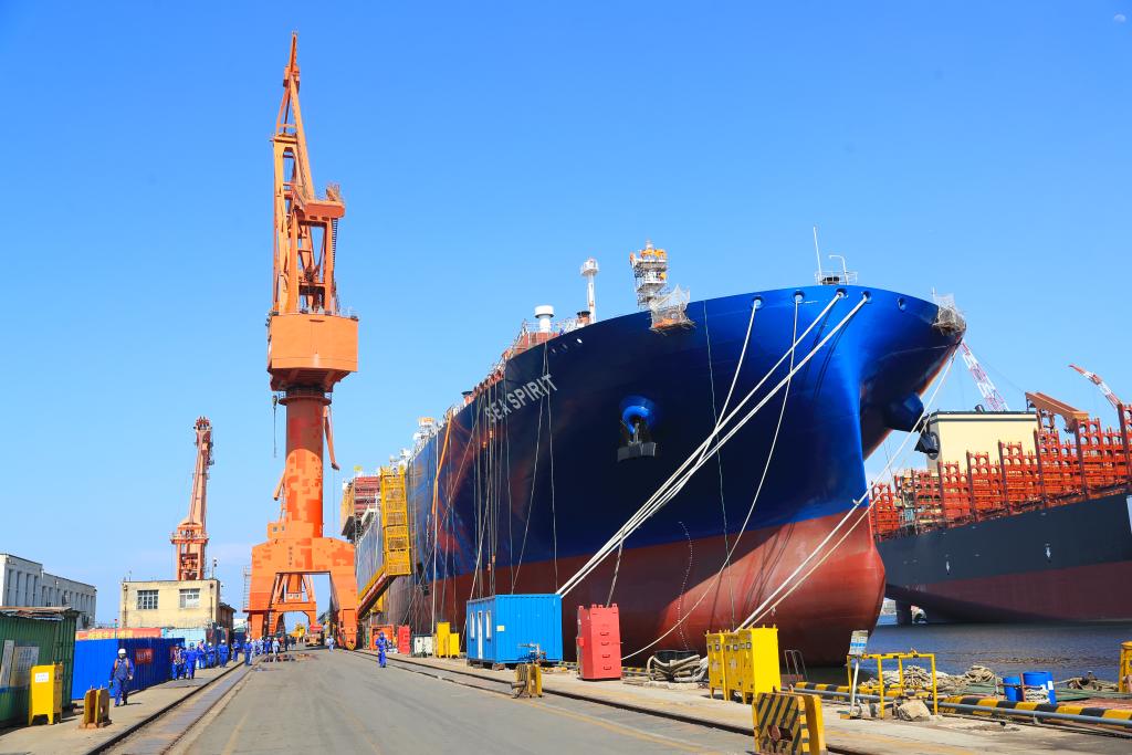 6月15日,在中國船舶集團大連船舶重工集團有限公司拍攝的正在建造的大型液化天然氣(LNG)運輸船。新華社記者楊青 攝