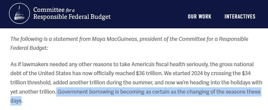 聯(lián)邦預(yù)算問(wèn)責(zé)委員會(huì)主席馬婭·麥吉尼亞斯在發(fā)言稿中直言:“如今,美國(guó)政府借款正變得像季節(jié)的變化一樣規(guī)律而確定。”