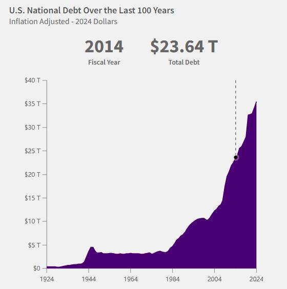 △美國(guó)財(cái)政部下屬的財(cái)務(wù)數(shù)據(jù)網(wǎng)站披露的數(shù)據(jù)顯示,美國(guó)國(guó)債總額從2014年的23.64萬(wàn)億美元升至2024年的超36萬(wàn)億美元,漲幅超52%,這一趨勢(shì)整體上仍在持續(xù)加快。