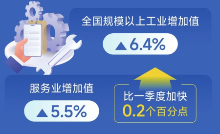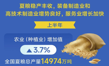 夏糧穩(wěn)產(chǎn)豐收,裝備制造業(yè)和高技術(shù)制造業(yè)增勢良好,服務(wù)業(yè)增長加快。上半年,農(nóng)業(yè)(種植業(yè))增加值同比增長3.7%,全國夏糧總產(chǎn)量14974萬噸;全國規(guī)模以上工業(yè)增加值同比增長6.4%,其中裝備制造業(yè)增加值同比增長10.2%,高技術(shù)制造業(yè)增加值增長9.5%,增速分別快于全部規(guī)模以上工業(yè)3.8和3.1個百分點(diǎn);服務(wù)業(yè)增加值同比增長5.5%,比一季度加快0.2個百分點(diǎn)。